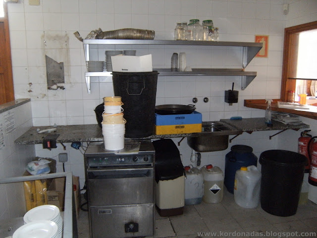 Me cuelo en la cocina donde hay bastante desorden general, aunque no por ello se pueden dejar de ver pilas de platos limpios dispuestos para ser usados en cualquier momento.